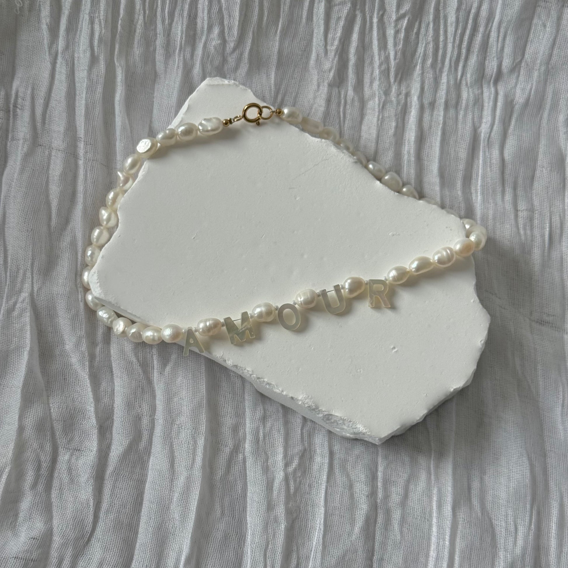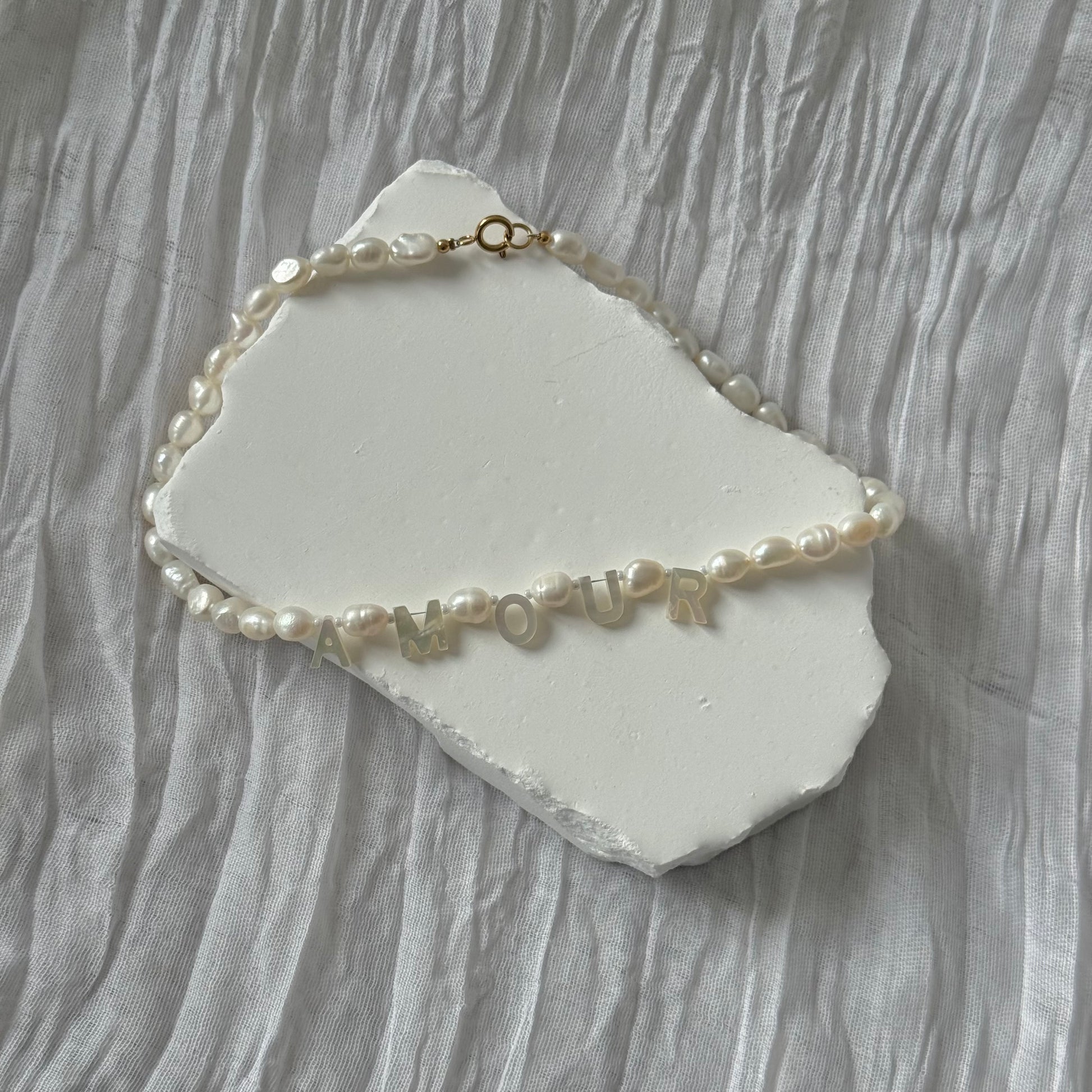 Ce bijou délicat est composé de perles d'eau douce sélectionnées avec soin, illuminées par des lettres argentées étincelantes qui forment le mot "AMOUR". Un symbole fort et élégant, à porter au quotidien ou lors de vos occasions spéciales.