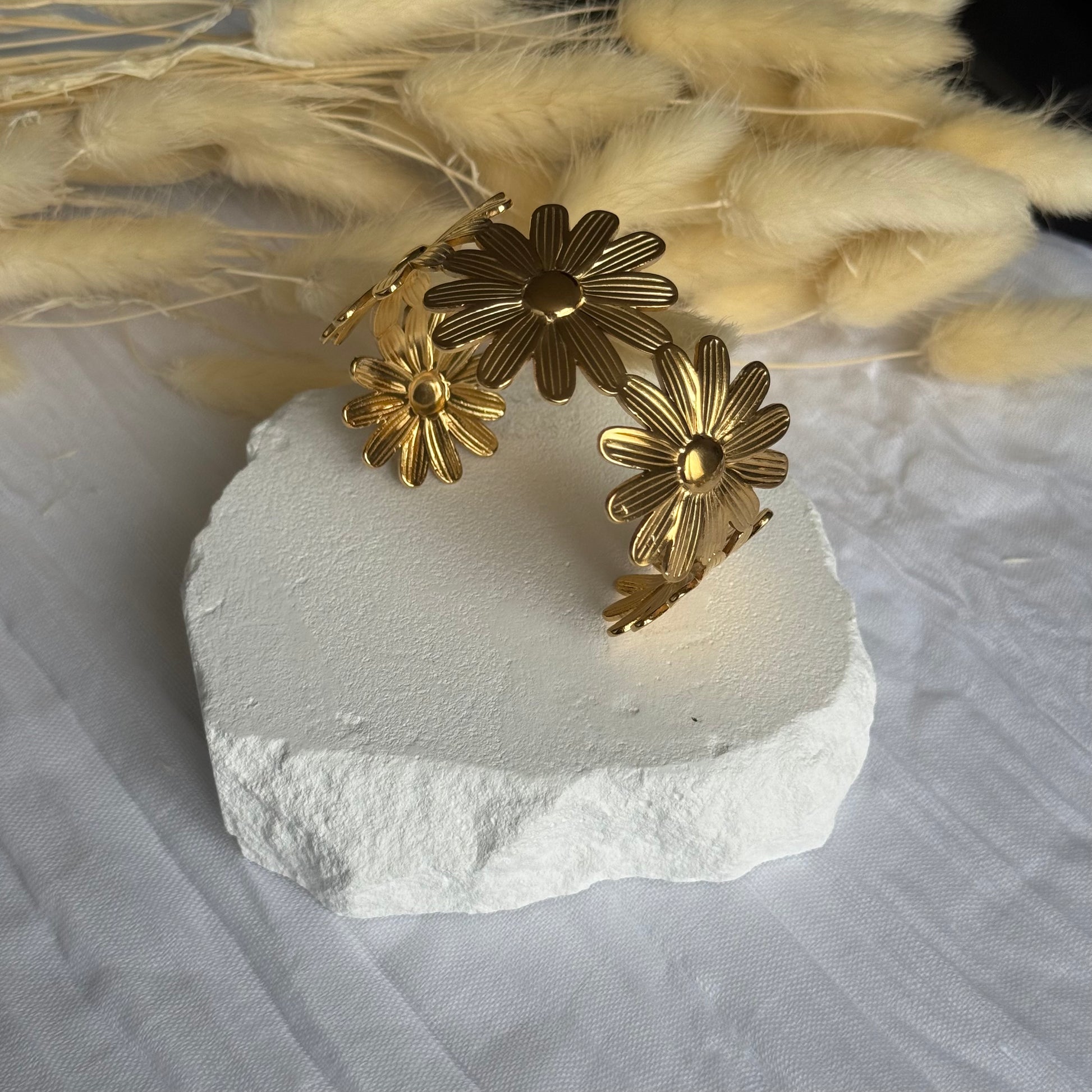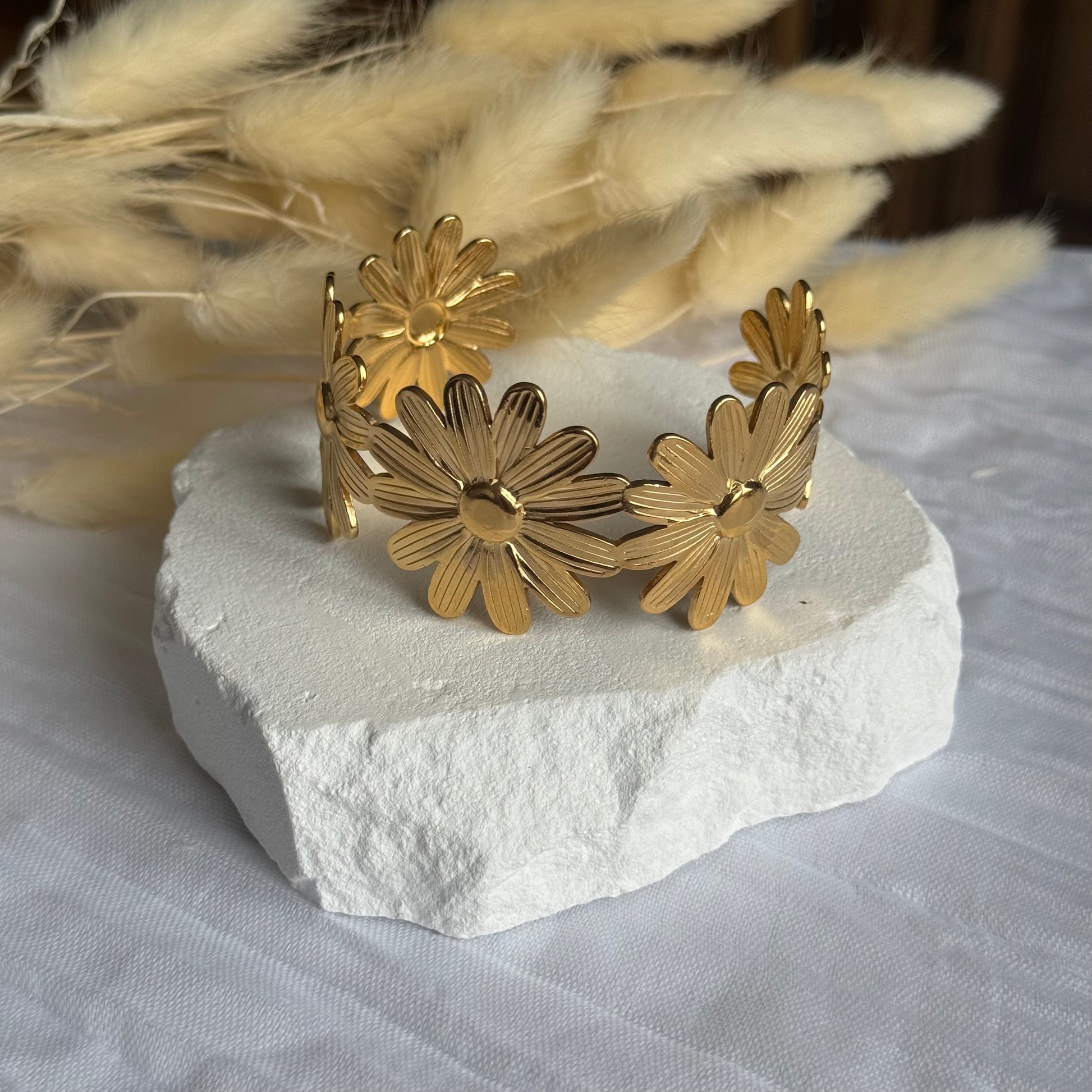 Bracelet doré orné de marguerites, symbole de fraîcheur et d’innocence. Un bijou délicat pour illuminer votre quotidien.
