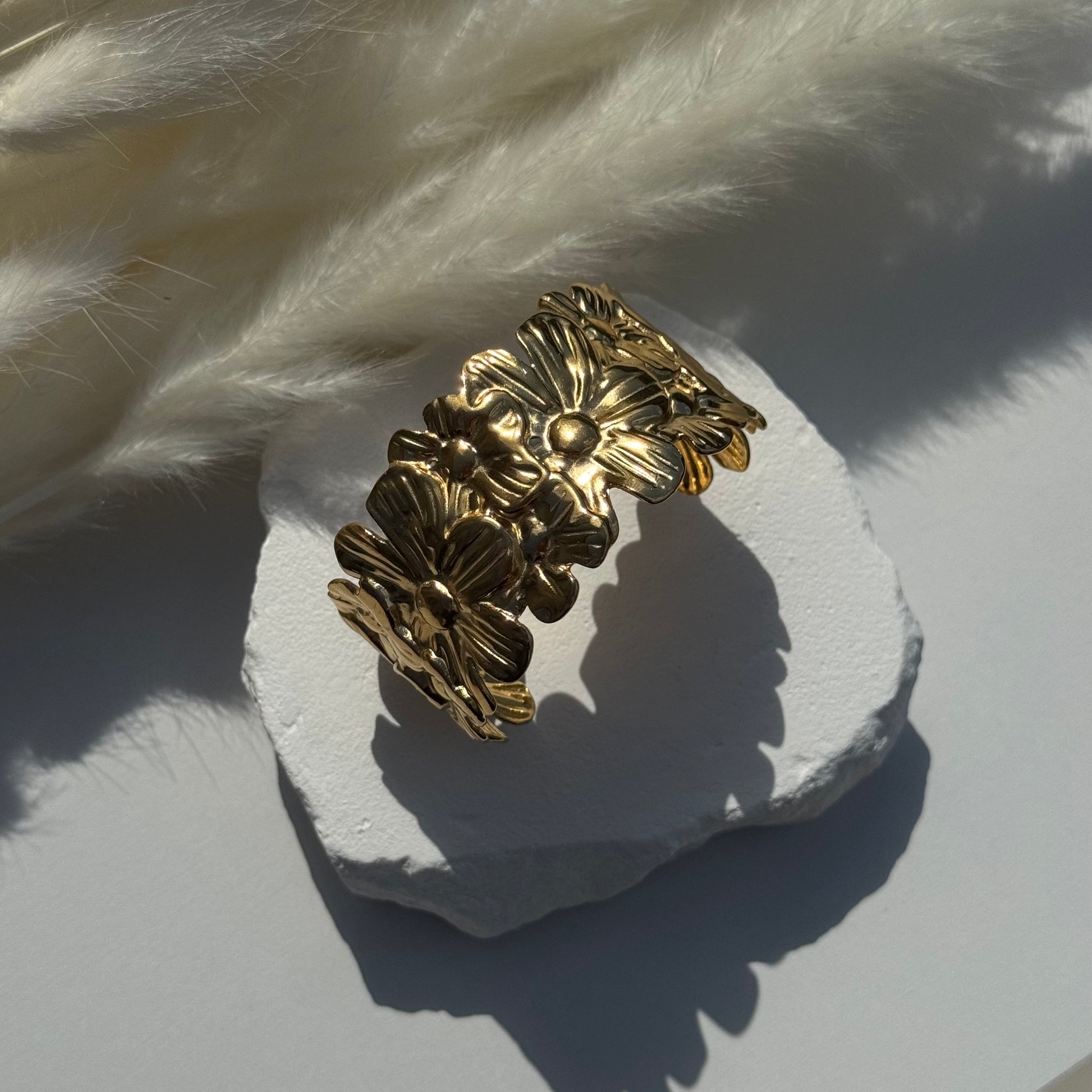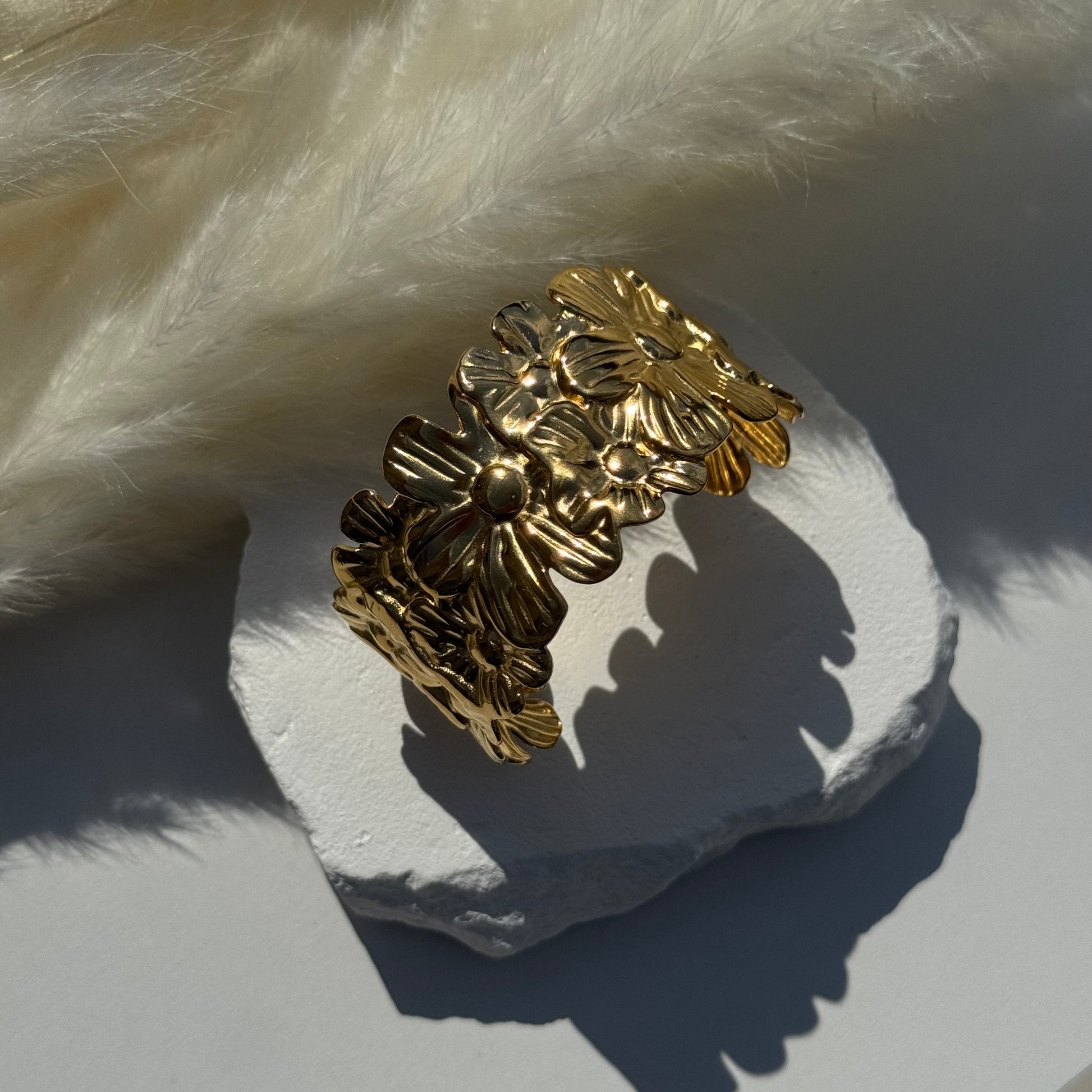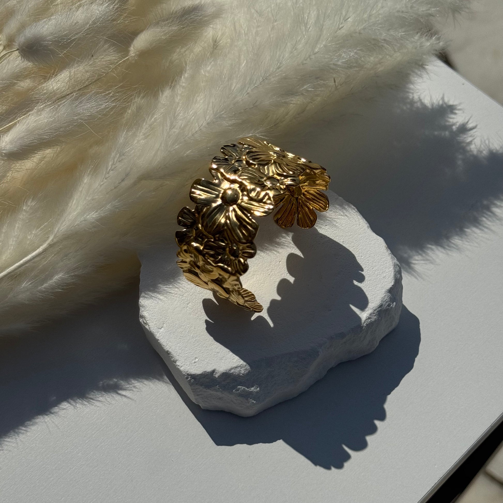 Bracelet doré orné de motifs floraux délicats, évoquant l’élégance et la féminité. Parfait pour ajouter une touche de raffinement à votre look.