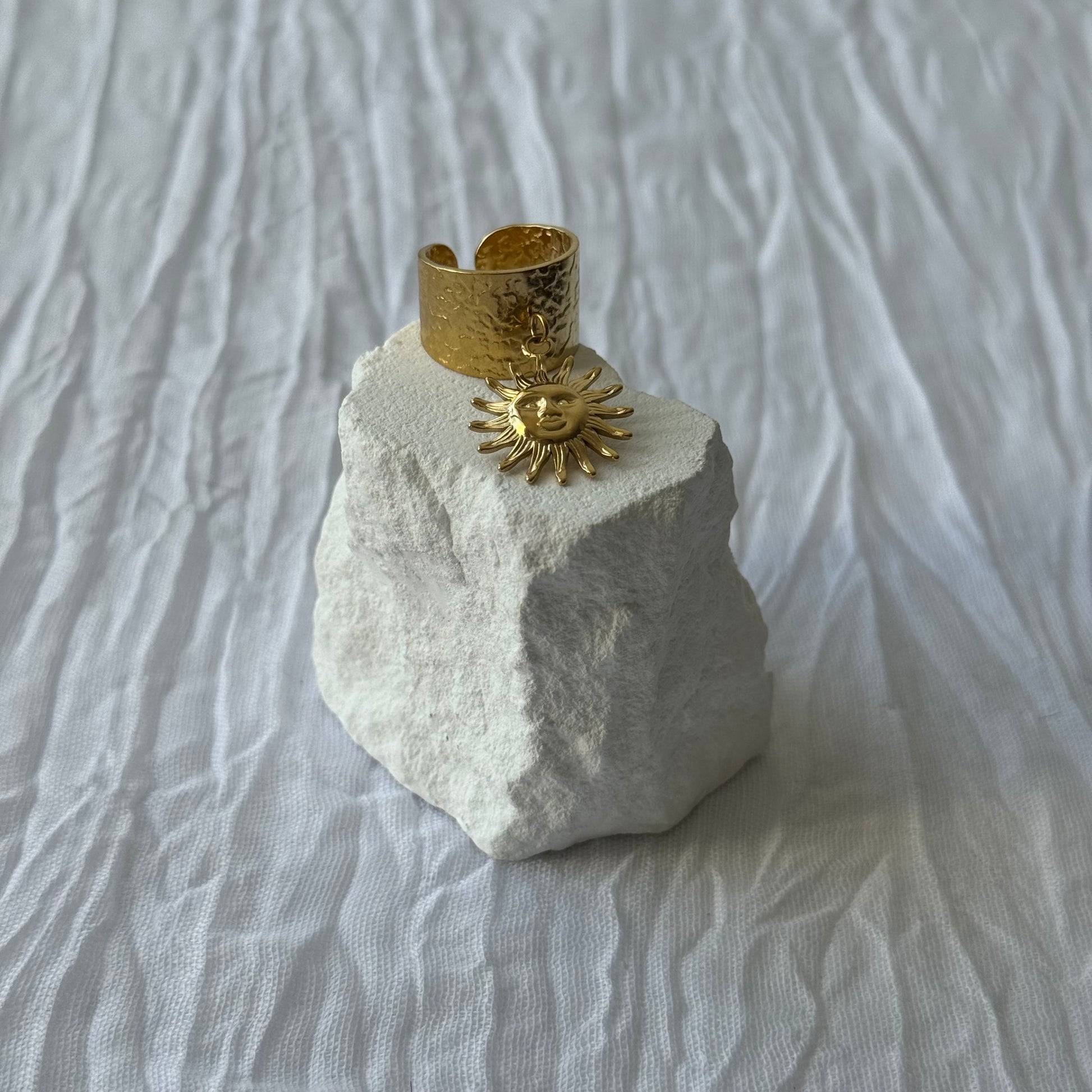 La bague SOLARA large au design texturé, sublimée par un pendentif soleil rayonnant.