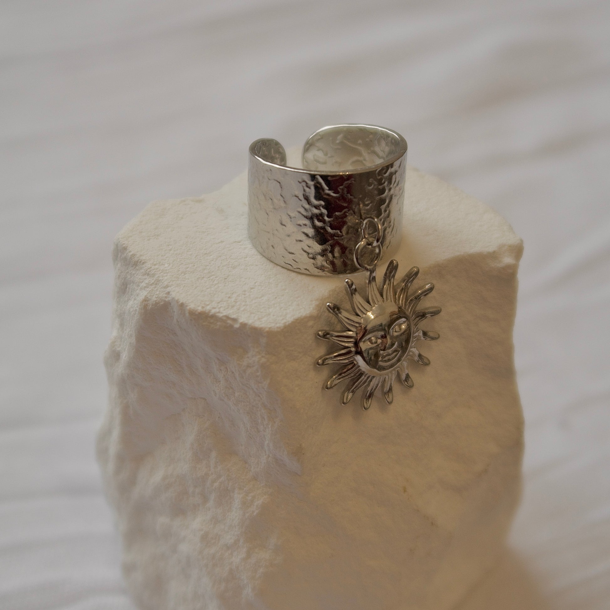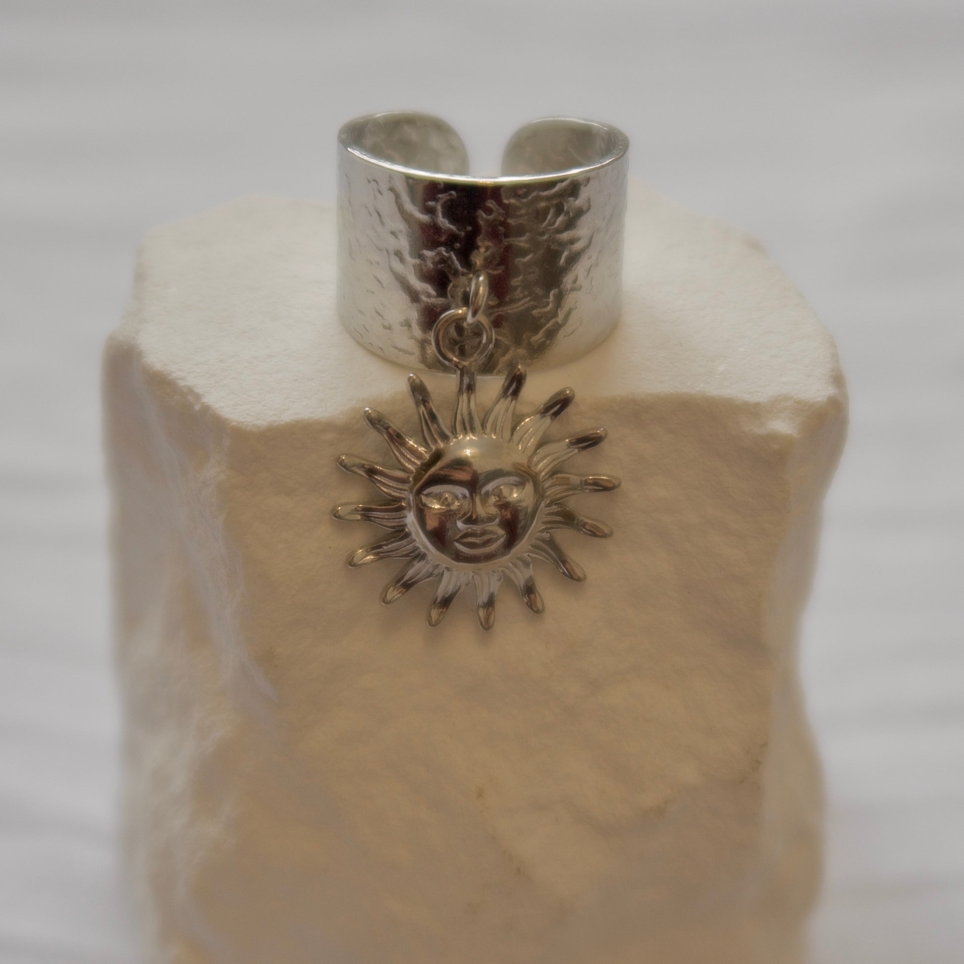 La bague SOLARA large au design texturé, sublimée par un pendentif soleil rayonnant.